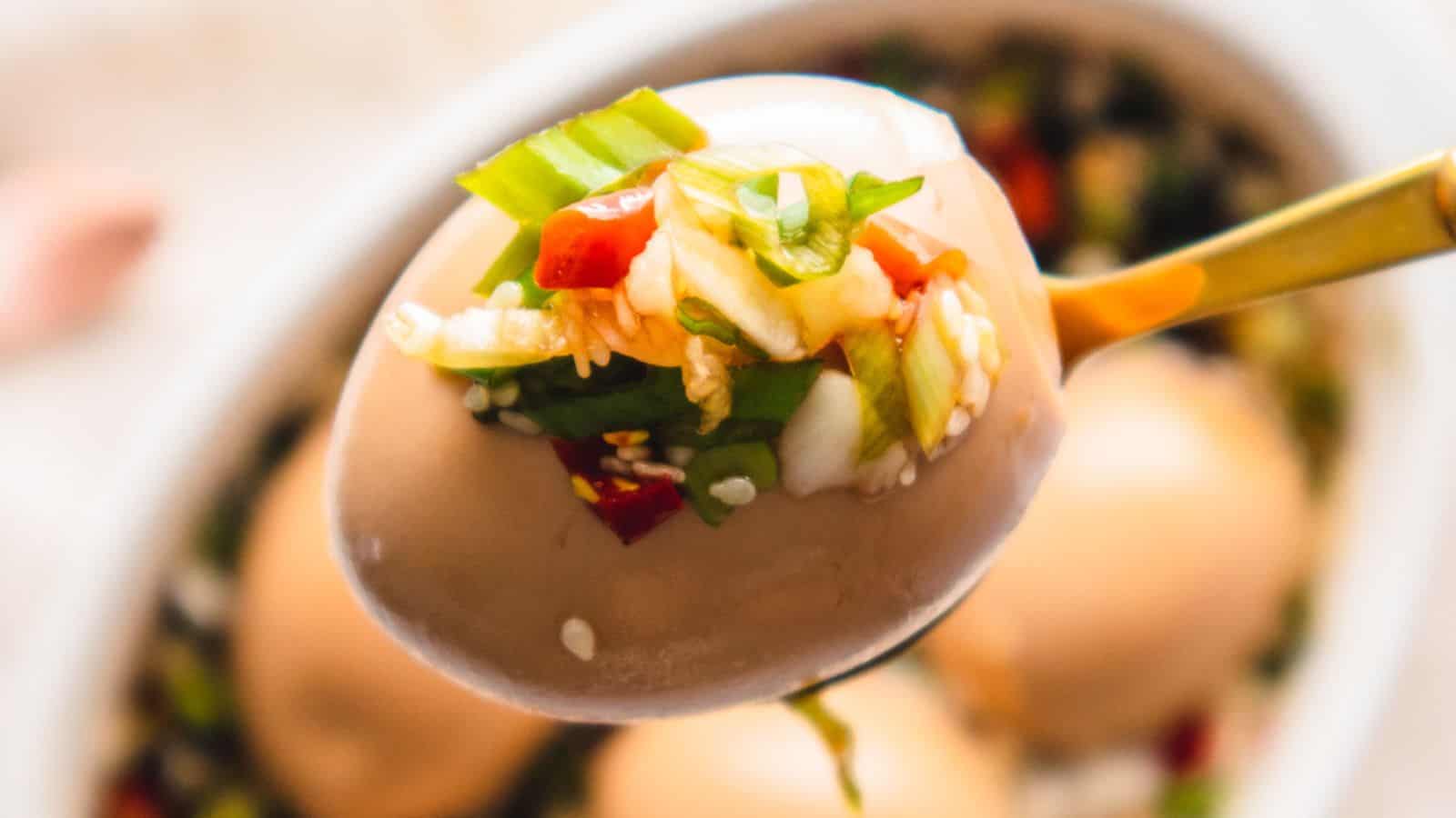 Spice up your party food with Kimchi Deviled Eggs. Crunchy pickled veggies and creamy yolk filling with tangy Korean kimchi. Quick to prepare, perfect for potlucks, dinner parties, or at-home snacking!