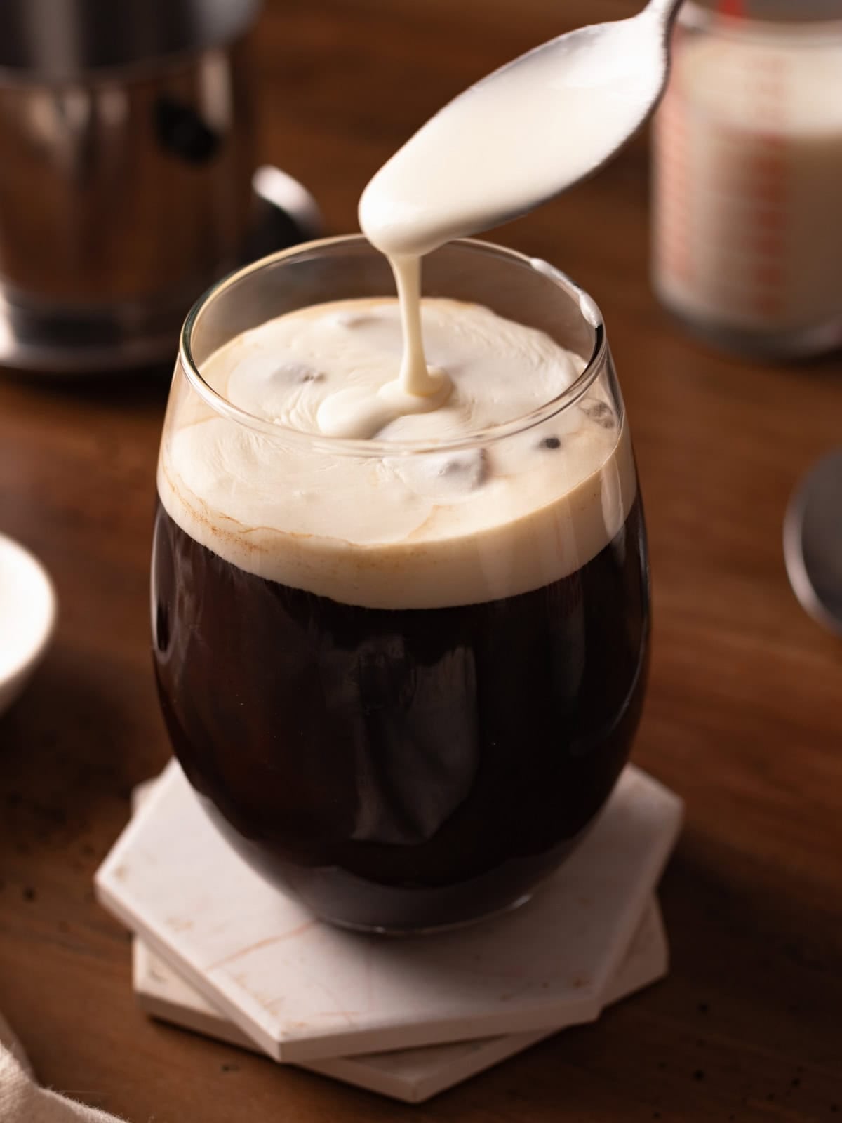 Once your brewed coffee has stopped dripping, remove the phin filter. If you prefer an iced version, add ice to the coffee, then scoop your salt cream on top. Give it a good stir before enjoying!